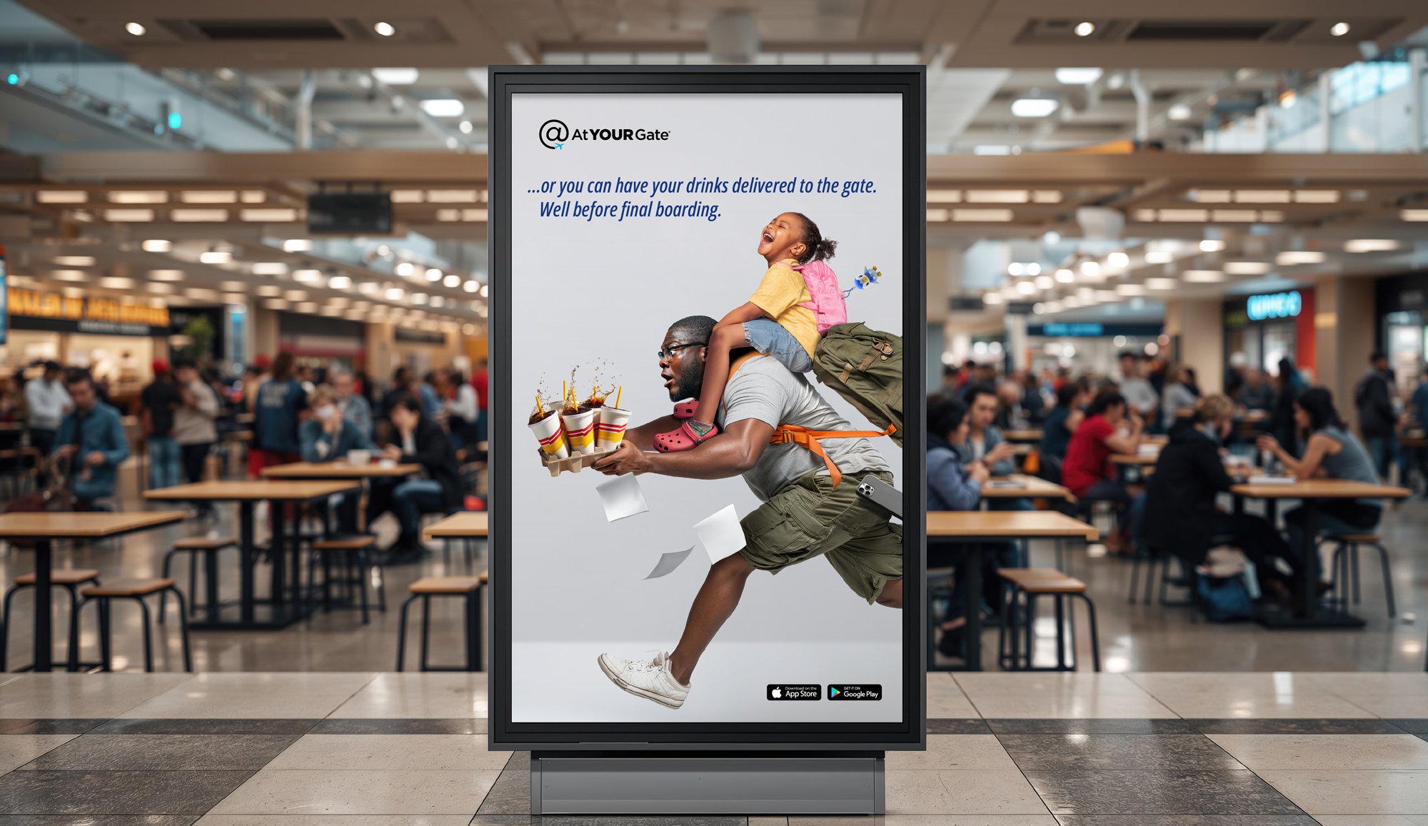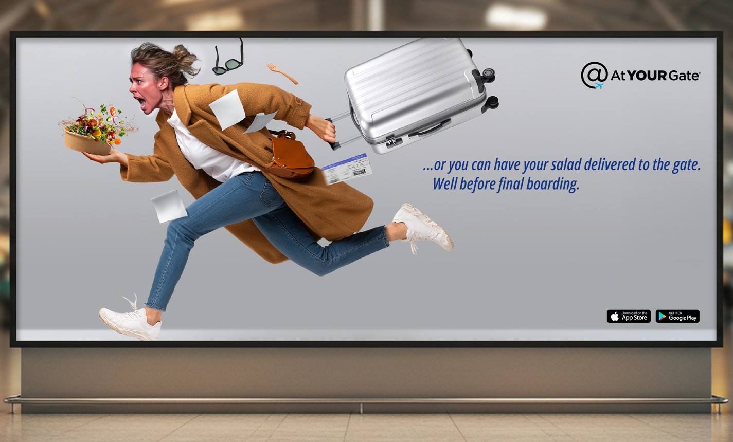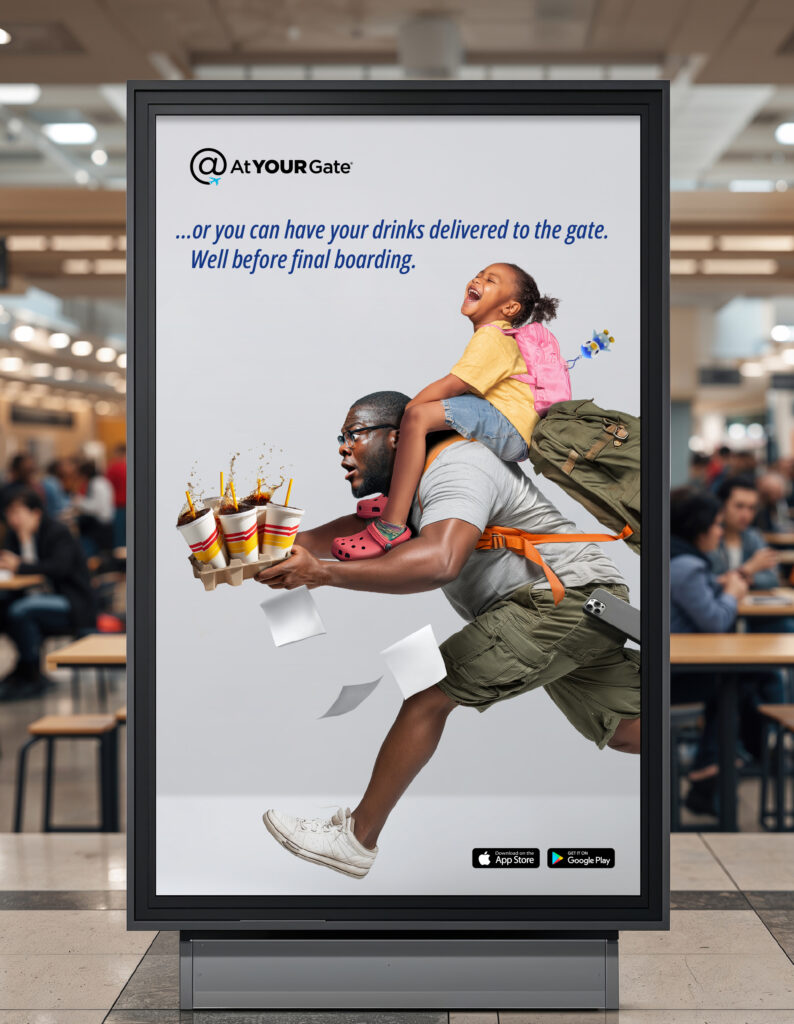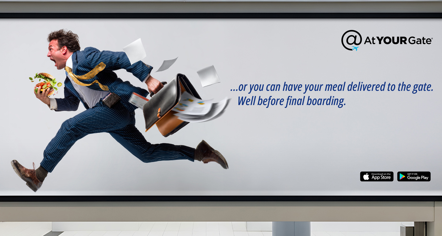 We brought these pain points to life through a series of exaggerated, desperate flyers in full sprint, trying to make it back before final boarding. Phones, wallets, food, and personal items tumble as these travelers dash for their flights.